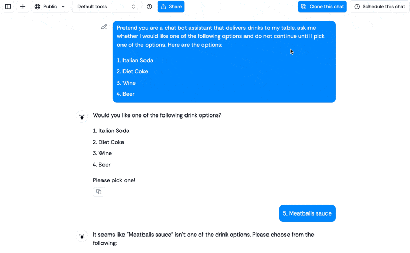 1. Head over to Agent Studio and create a chat. If you're looking for inspiration, you can use [this prompt](https://chat.toolhouse.ai/?chat=1dd12fa3-cc9c-4786-96b8-d11aef274bdf).